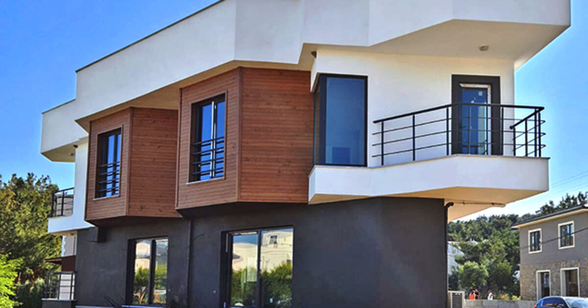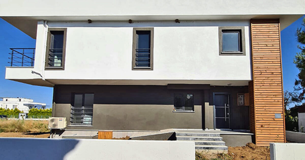 Our villa in the Güzelyalı area has a construction area of 290 m² and features a spacious terrace with a unique sea view. The colors chosen for the facade and the wooden panel cladding allow the structure to blend harmoniously with its surroundings. The villa was handed over to its residents after the landscaping was completed.